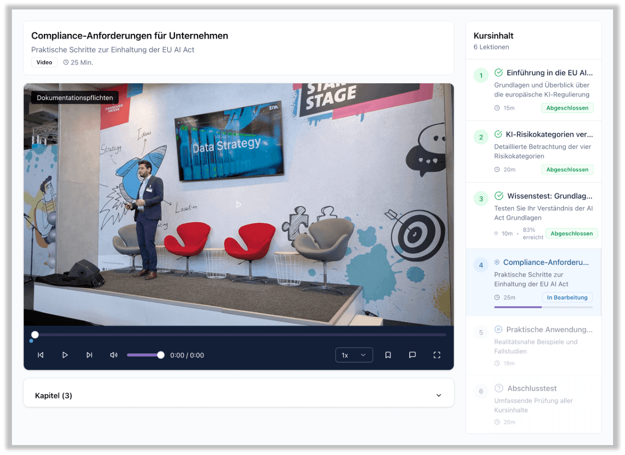 Der Ziya Campus ist unsere Online-Plattform für praxisnahe KI-Weiterbildung. Mit interaktiven Kursen, strukturierten Lernpfaden und Fortschrittstracking lernen Ihre Teams flexibel und ortsunabhängig — von Einsteiger-Modulen bis hin zu fortgeschrittenen Trainings für KI-Strategie und Agentensysteme.